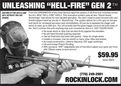 Hell fire gen 2 snap on trigger system. It is the epitome of all any rapid fire trigger reset system ever. All metal with rate of fire adjustment you pull your guns trigger allows for single shots and more safely and legally. It is the epitome of all any rapid fire system ever.